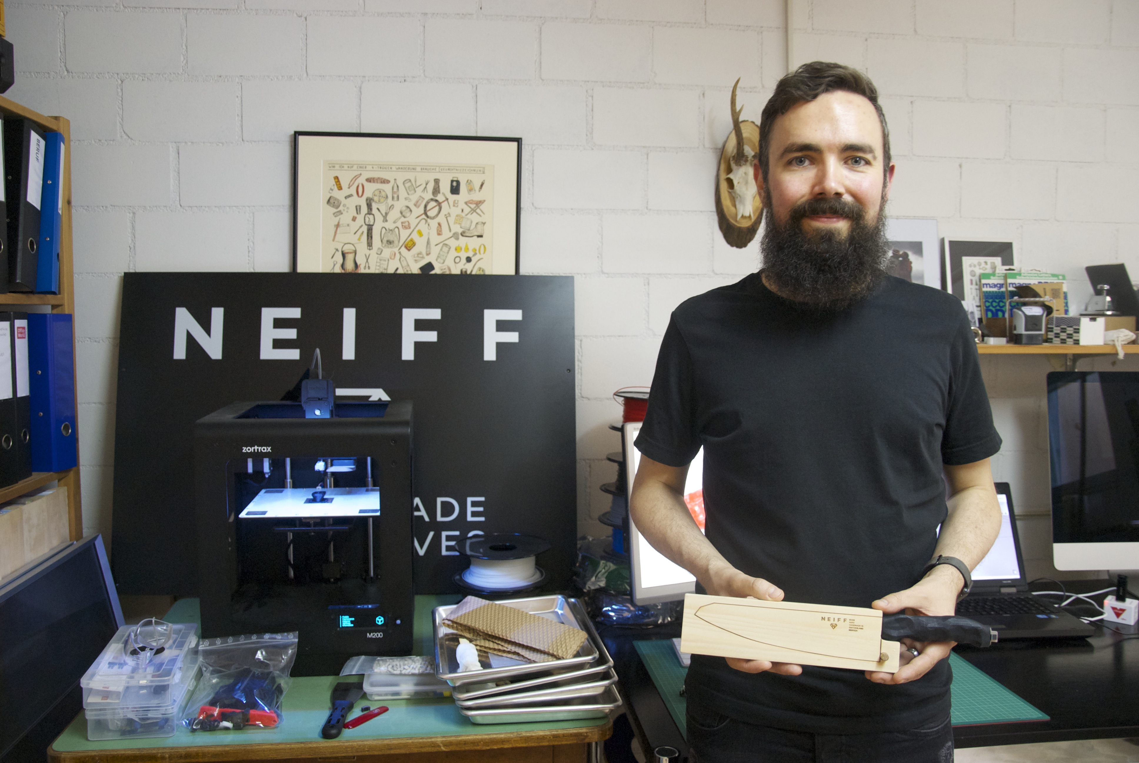 Adrian Gögl stellt unter seinem Label NEIFF Küchenmesser mit massgefertigten Griffen her. Mit Hilfe einer Holzattrappe und Modelliermasse nimmt er den Handabdruck seiner Kunden und erstellt aus diesem Abdruck personalisierte Messergriffe. Nebenbei ist Adrian zu 80% als Designer und Projektleiter bei Götti Switzerland angestellt, verheiratet und Vater einer kleinen Tochter. Adrian fände es schön, wenn sich die Stellenprozente mit der Zeit von Brillen in Richtung Messer verschieben könnten. Für unsere Blogserie zum Thema Arbeit 2.0 habe ich Adrian Gögl in seinem Kelleratelier interviewt: